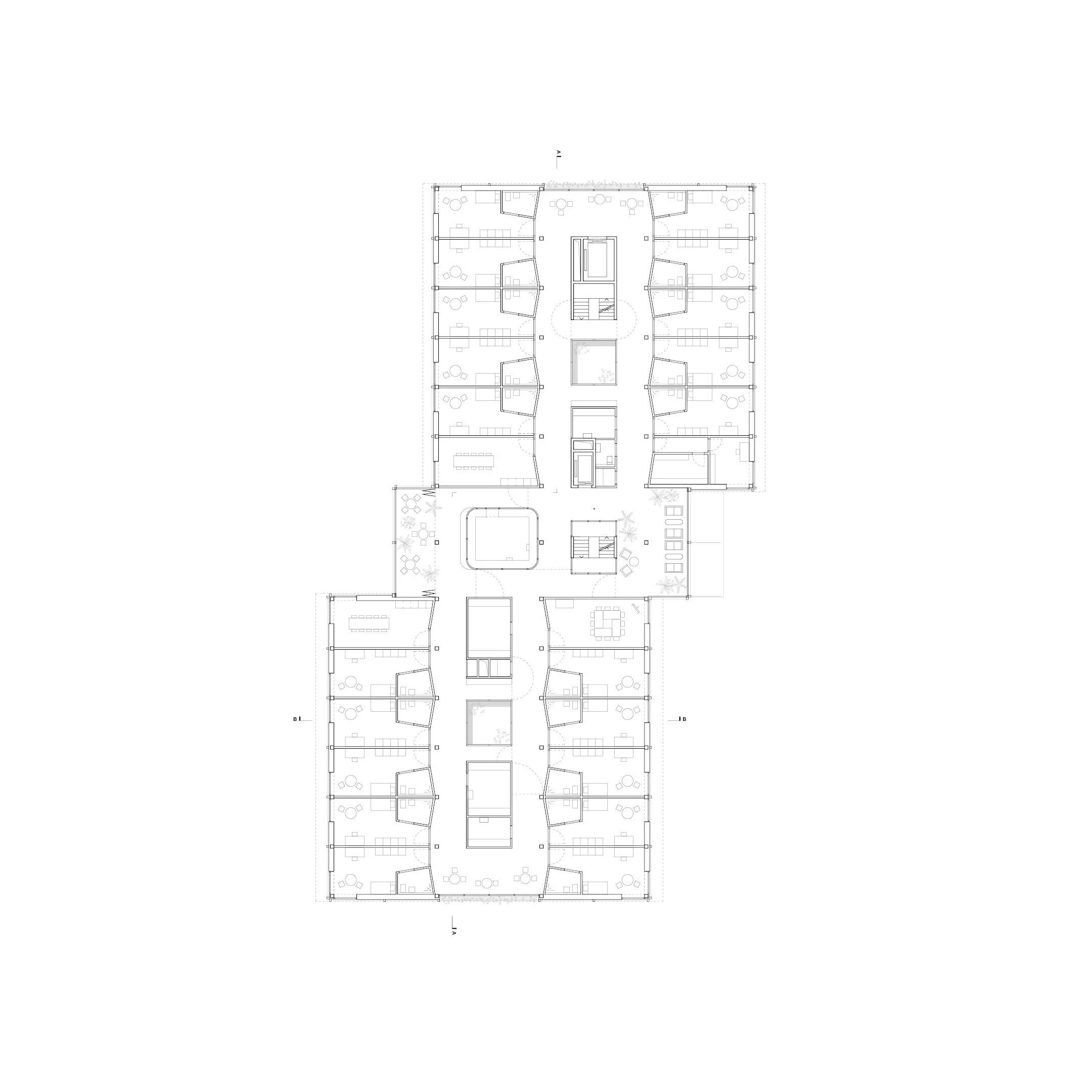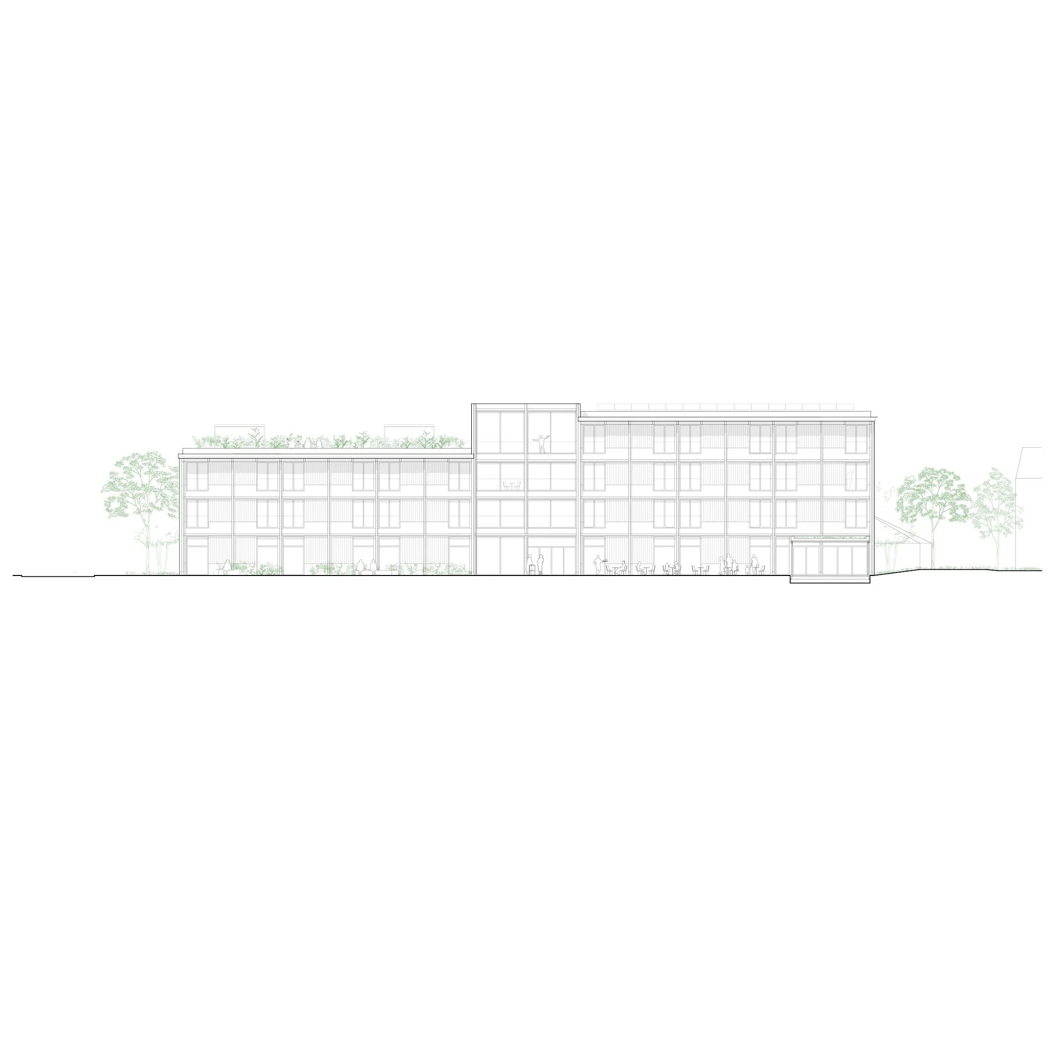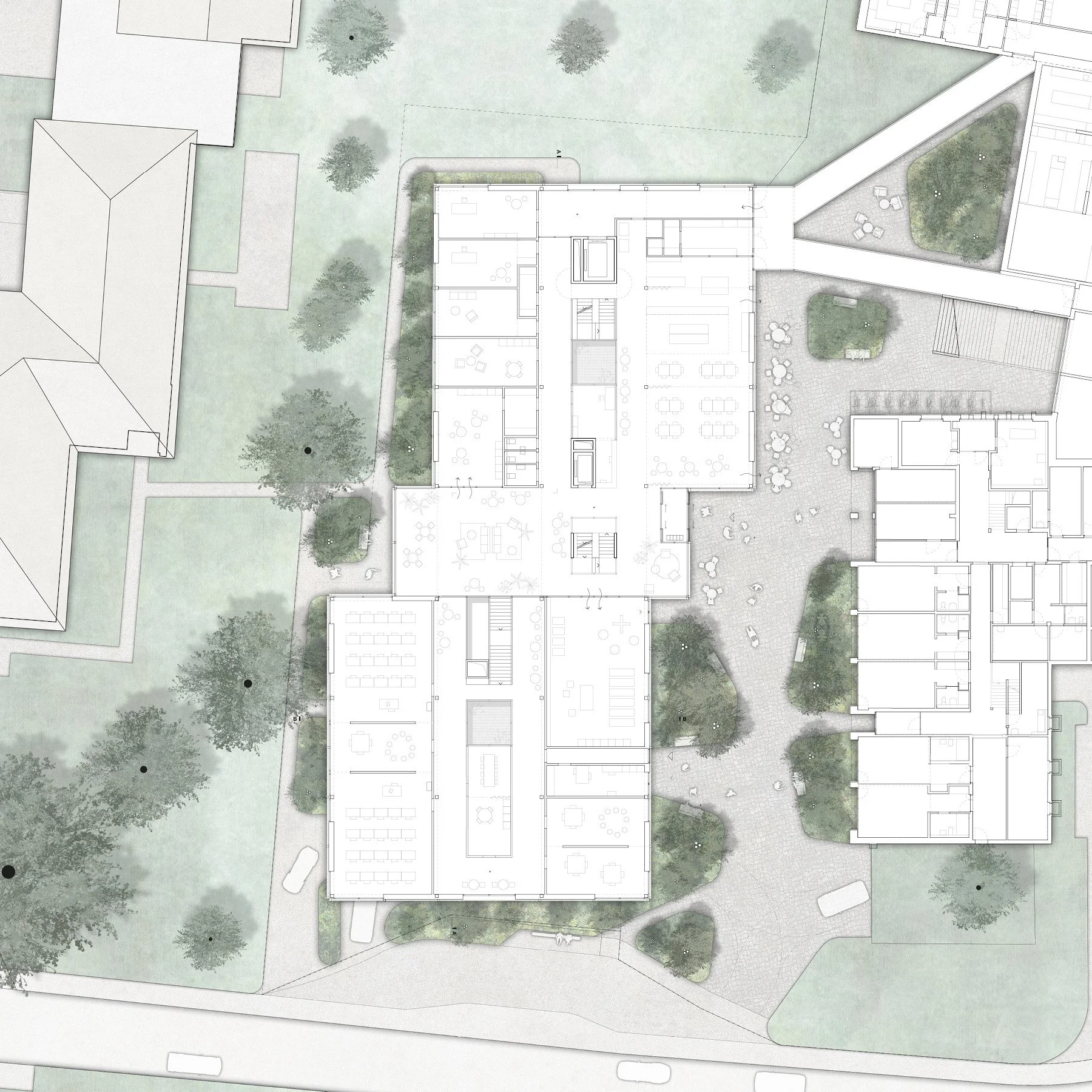 The ground floor is transparent, flexible and defined by its public character. In addition to reception, cafeteria and administration, public programmes such as an education centre, hair salon and underground parking are integrated, allowing the building to participate in neighbourhood life. New paths, squares and open spaces connect the building with the hospital campus. A roof garden, courtyards and landscaped outdoor areas provide therapeutic, ecological and social qualities.
