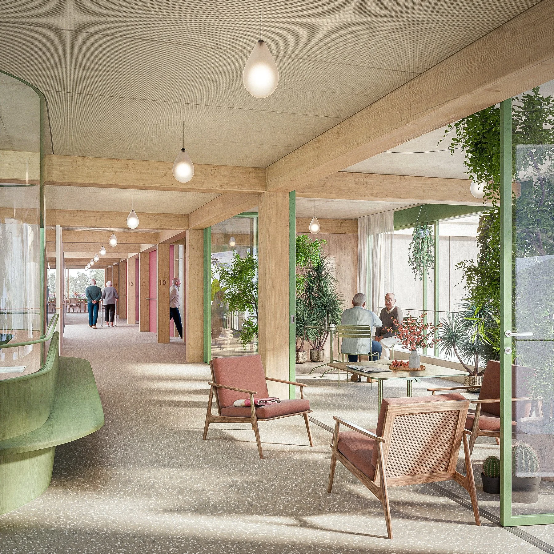 The typical floors follow an established dementia friendly principle with continuous looped circulation and no dead ends. Folded corridor walls create transition zones in front of the rooms, strengthen a sense of belonging and soften the rationality of the structural layout. Daylight, views, courtyards and places to pause structure everyday life, while materials such as timber, linoleum and warm colours create a domestic atmosphere.