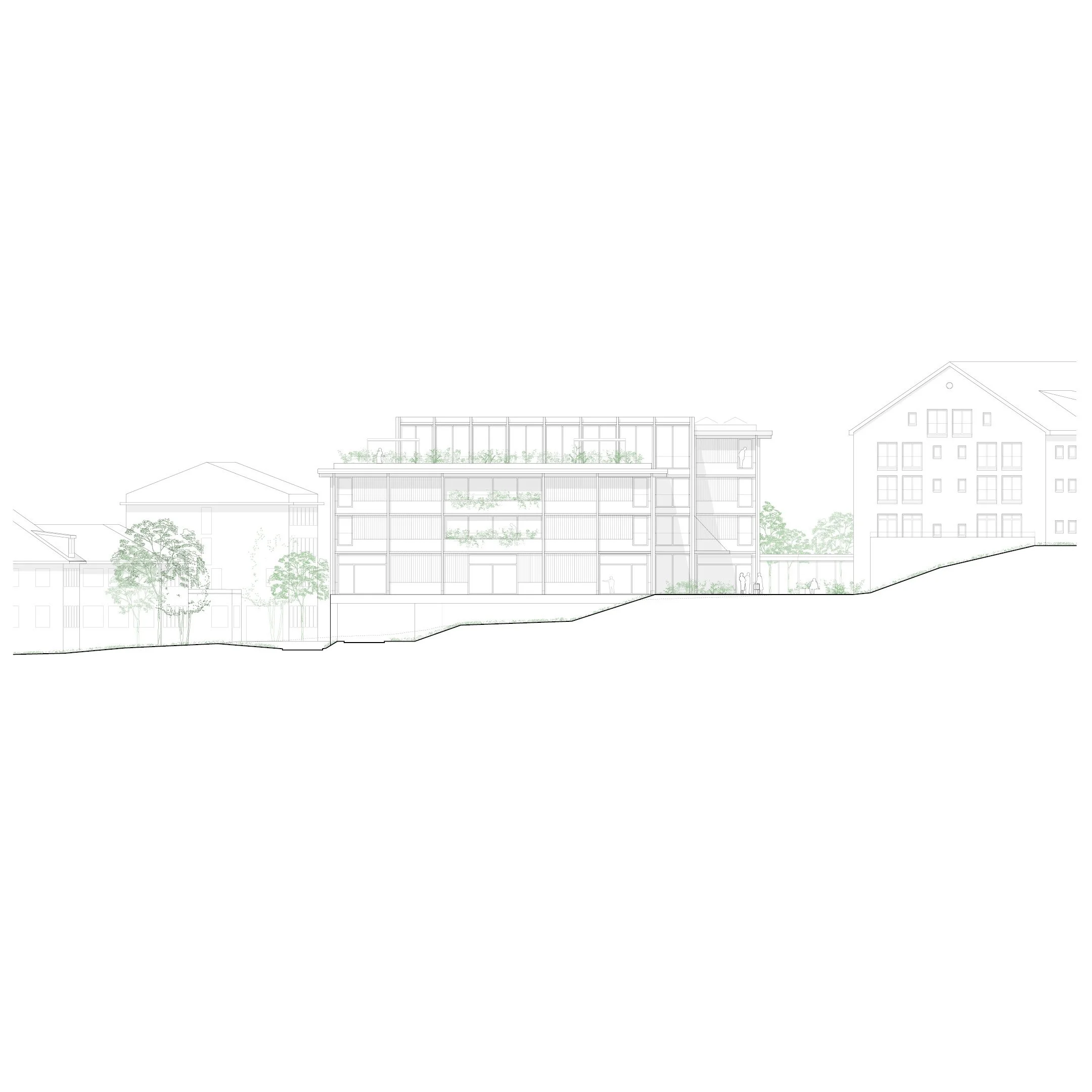 The new building for the Schiers Retirement and Nursing Home is conceived as a mediating structure between the village scale timber architecture along Dorfstrasse and the larger scale of the hospital campus. Through its perpendicular orientation to the street, its placement along the western boundary of the site, and the articulation into three staggered volumes, a welcoming arrival courtyard is created with clear spatial relationships to the village, the hospital and the existing retirement home. The building appears both as part of the surrounding neighbourhood and as an autonomous element within the campus ensemble.