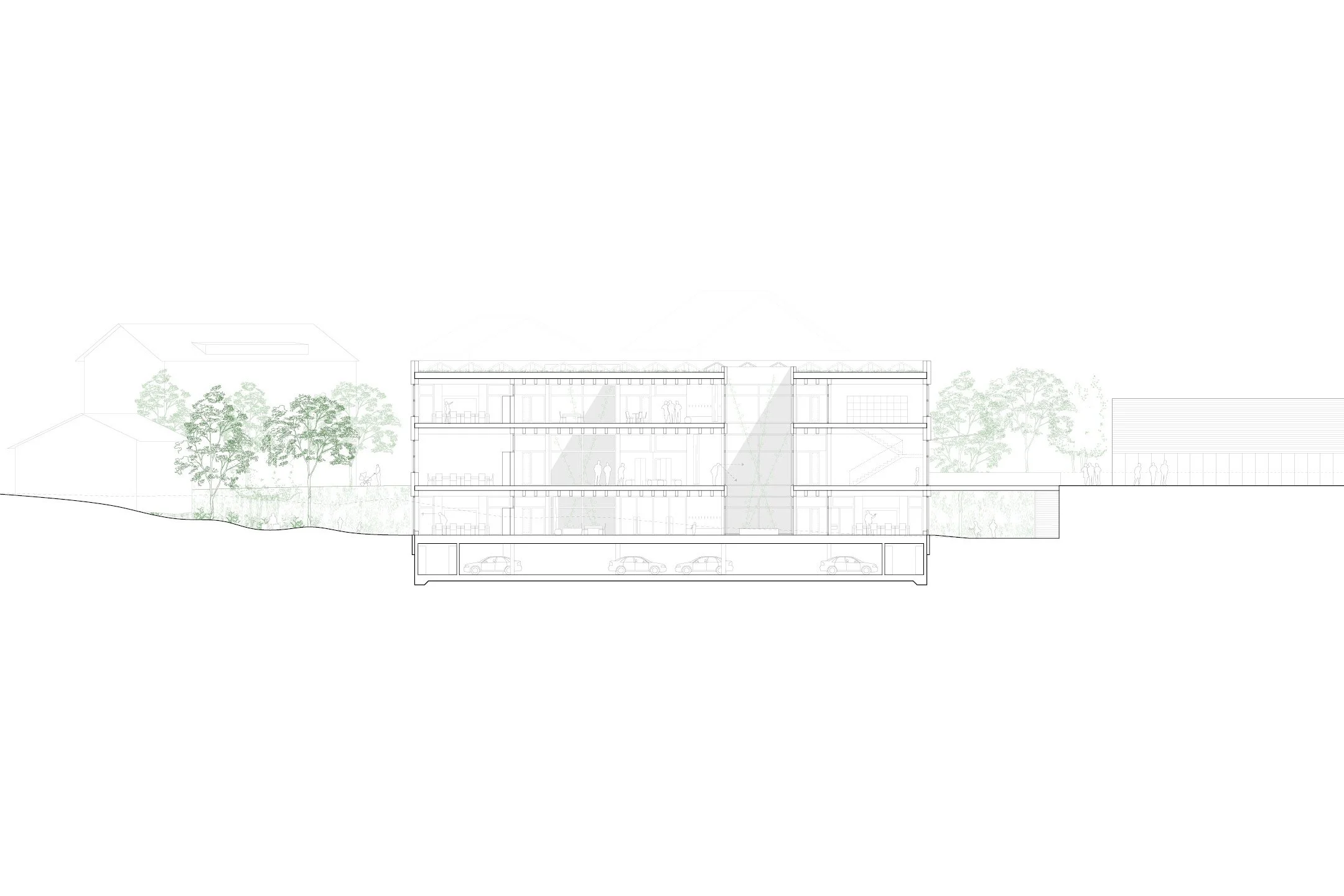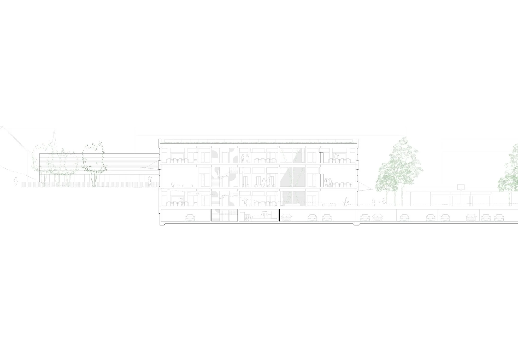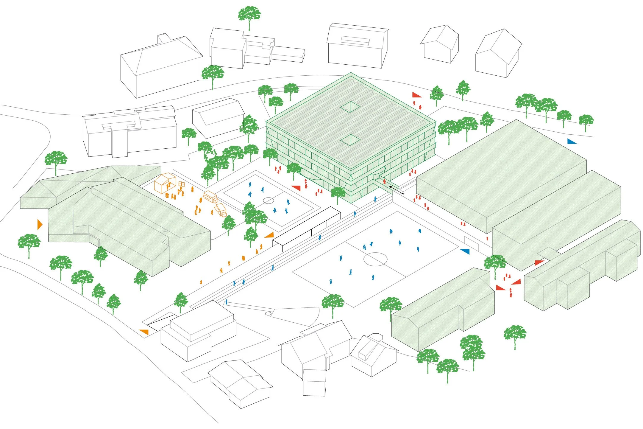 The Ochsenmatt school campus extension proposes a compact three-storey timber building placed above an underground parking structure, preserving the park-like character of the existing ensemble and maintaining generous, publicly accessible open spaces. The new building occupies a footprint comparable to the adjacent sports hall and, together with it, defines a network of outdoor spaces for school use and neighbourhood life alike.