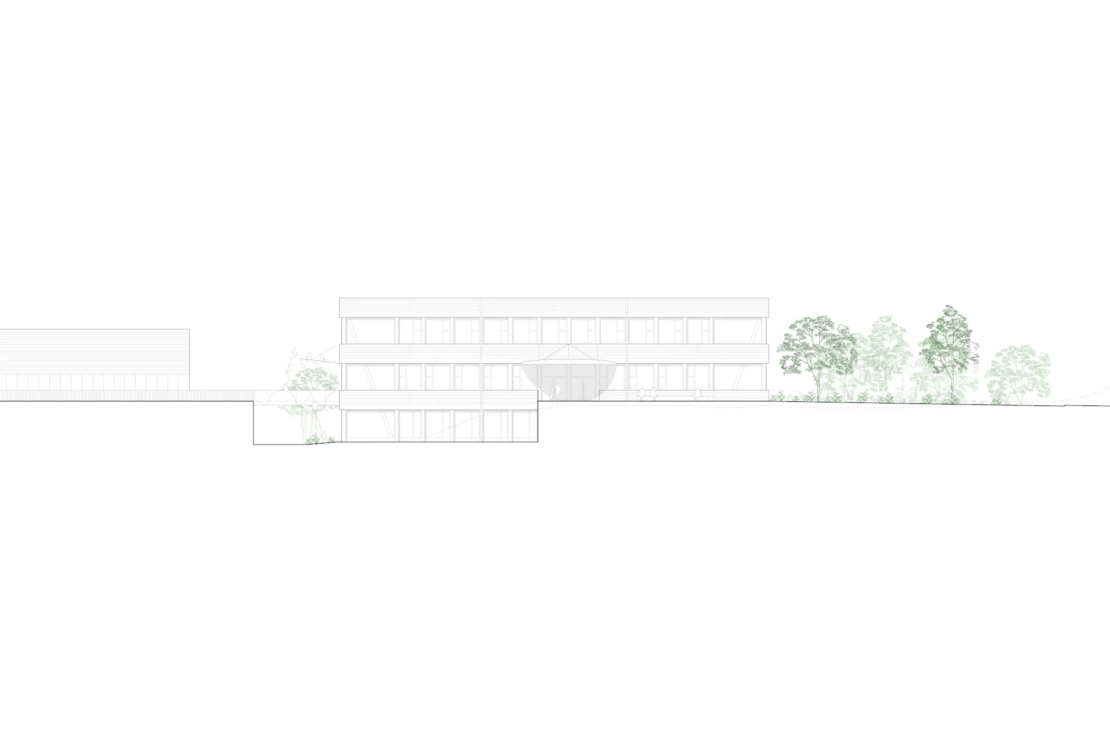 The structural logic is made legible on the facade: exposed timber columns at a 2.70 m rhythm articulate the envelope, while horizontal cladding bands and strip windows emphasise the layered, floor-by-floor reading of the volume. Canopies at the entrance points and the bridge to the gym are the building's most precise gestures, marking access, mediating levels and anchoring the new structure within the existing topography.