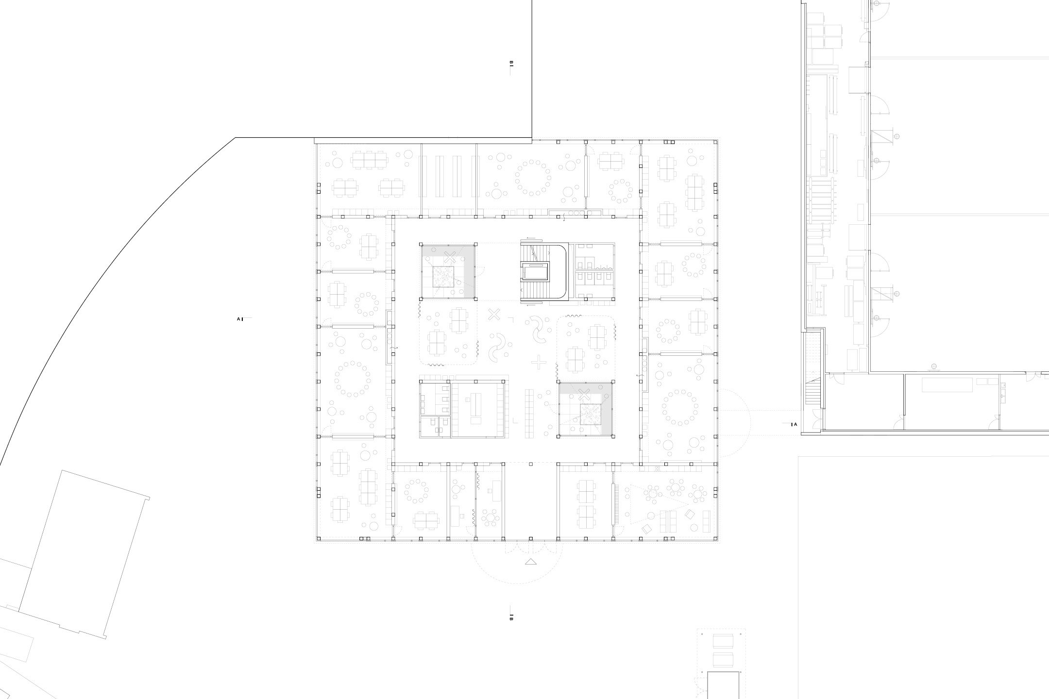 Each floor follows a consistent organisational principle: an open learning landscape at the centre, flanked by classrooms and group rooms arranged in a continuous ring. Two asymmetrically placed light courts draw daylight deep into the building, provide natural ventilation and create moments of spatial orientation. The free middle zone, lit from above, dissolves the conventional corridor into a genuine learning landscape where movement, pause and informal learning coexist. Thick infrastructure walls along the hall perimeter carry services and storage; above them, a continuous ribbon window just below the ceiling reads the ceiling as an uninterrupted surface of exposed timber ribs.